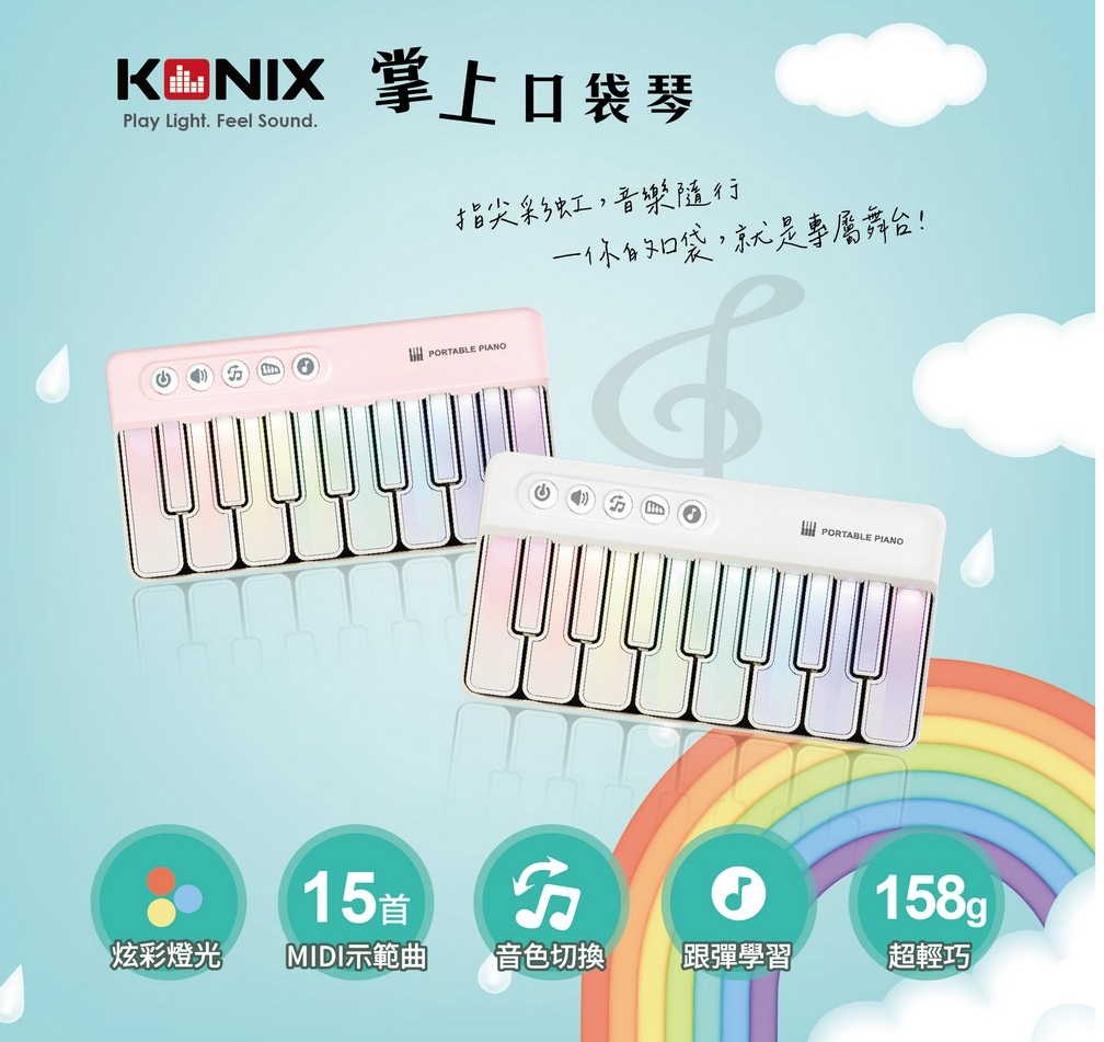 音樂,不該被體積限制。 KONIX 口袋琴僅 158g 的迷你身形,輕鬆裝進背包、提袋或口袋裡,七彩漸變燈光・輕巧隨行的音樂靈感!無論是節日禮物、生日驚喜或還是犒賞自己的小確幸,KONIX 口袋琴讓學習與娛樂隨身帶著走!