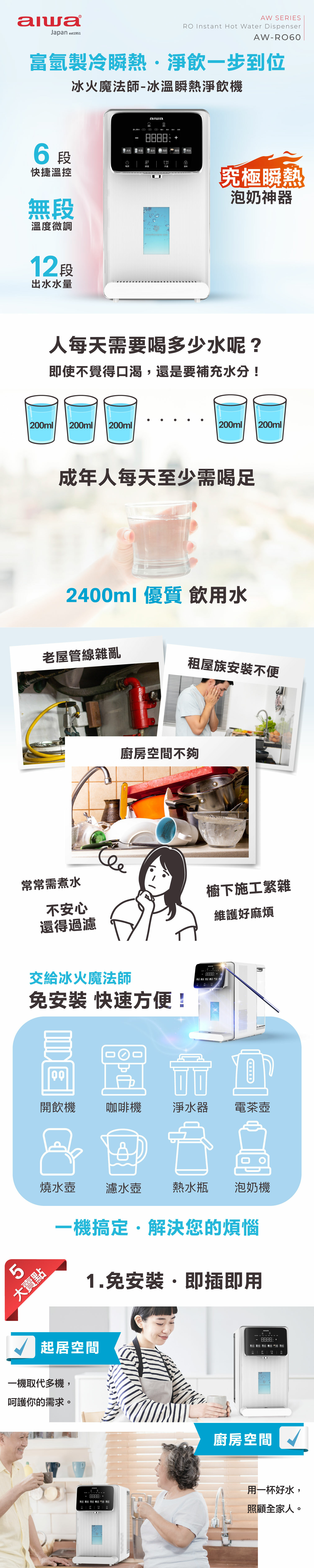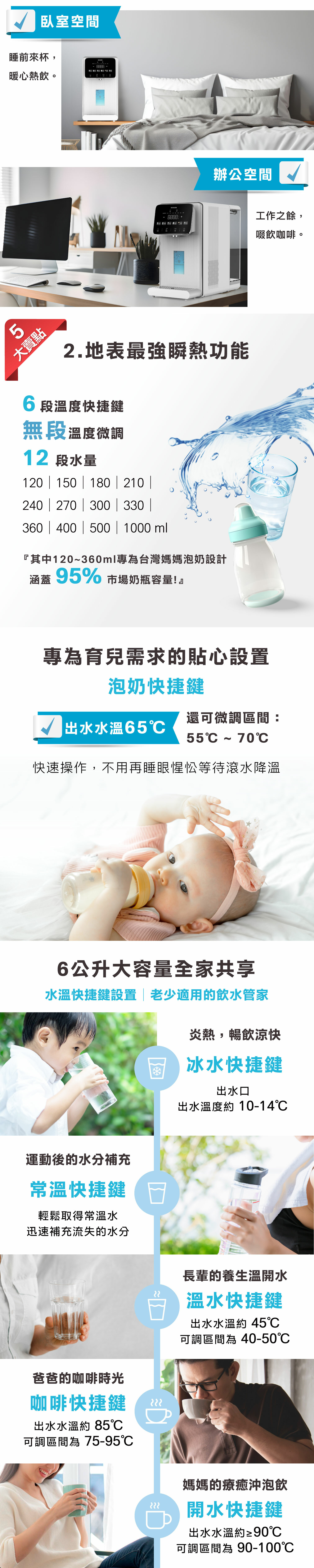 .六段水溫快捷鍵,冰水、常溫、溫開水、泡奶、咖啡、開水可微調水温40~100℃